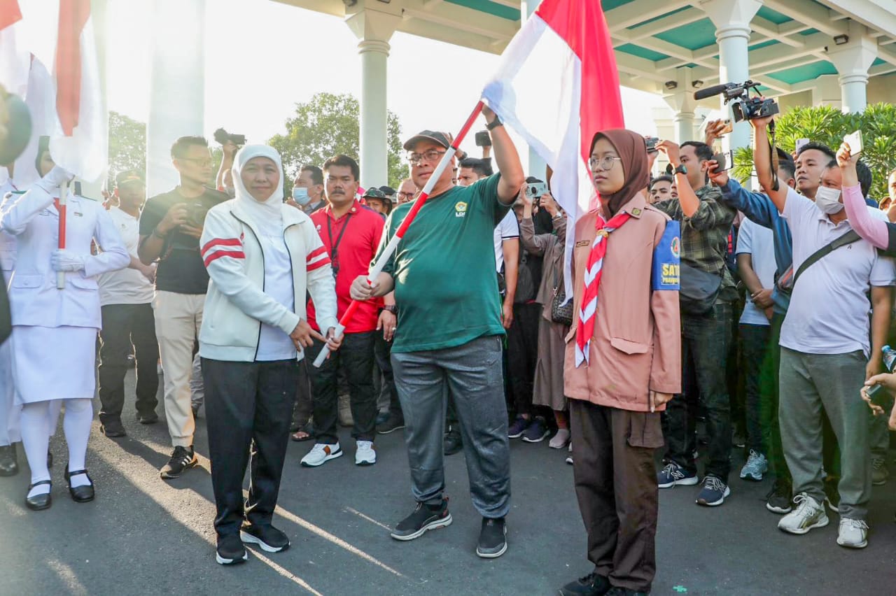 Sebelum jalan sehat, Gubernur Khofifah membagikan bendera merah putih dan mengajak para peserta menyanyikan lagu Bendera yang dipopulerkan group band Cokelat.