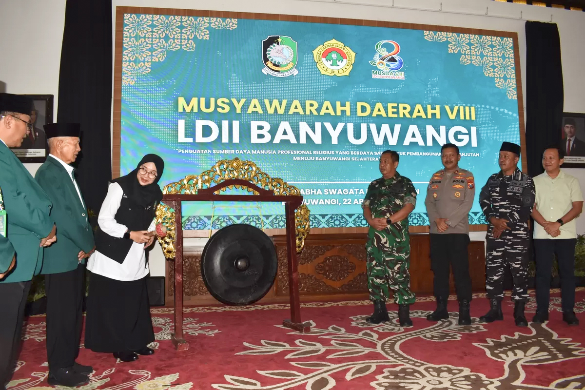 BANYUWANGI — Bupati Banyuwangi Ipuk Fiestiandani membuka Musyawarah Daerah (Musda) VIII Lembaga Dakwah Islam Indonesia (LDII) Kabupaten Banyuwangi di Pendopo Sabha Swagata Blambangan, Rabu (22/4/2026). Dalam kesempatan tersebut, Ipuk menegaskan apresiasinya terhadap peran LDII sebagai mitra strategis pemerintah daerah dalam mendukung pembangunan dan penguatan karakter masyarakat.