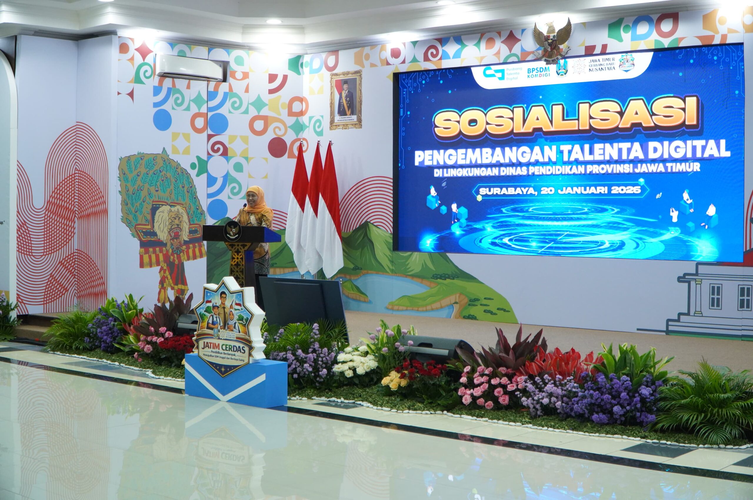 SURABAYA — Gubernur Khofifah Indar Parawansa menargetkan Jawa Timur menjadi lumbung talenta digital nasional. Penguatan pendidikan dilakukan dengan melibatkan 2.600 tenaga pendidik dalam sosialisasi Program Pengelolaan Talenta Digital Nasional.