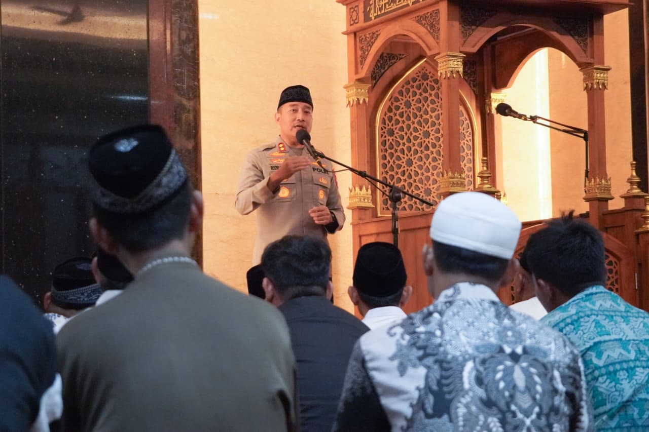 SURABAYA — Wakapolrestabes Surabaya, AKBP Rosyid Hartanto, menggelar Safari Ramadan bersama warga Pimpinan Cabang Lembaga Dakwah Islam Indonesia (PC LDII) Gunung Anyar di Masjid Nurul Hikmah, Surabaya, Sabtu (14/3). Kegiatan tersebut diisi dengan shalat tarawih berjamaah serta penyampaian pesan keamanan dan ketertiban masyarakat (kamtibmas) kepada warga.