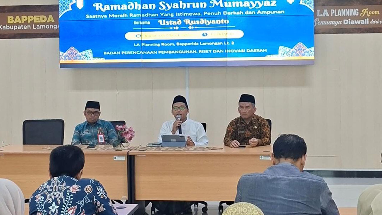 LAMONGAN — Pengurus Bagian Pendidikan Agama dan Dakwah DPD LDII Lamongan, Ustaz Rusdiyanto, menyampaikan tausiyah Ramadan kepada staf Badan Perencanaan Pembangunan, Riset dan Inovasi Daerah (Bapperida) Kabupaten Lamongan. Kegiatan berlangsung di LA Planning Room, lantai 2 Kantor Bapperida Lamongan, Jumat (6/3/2026).